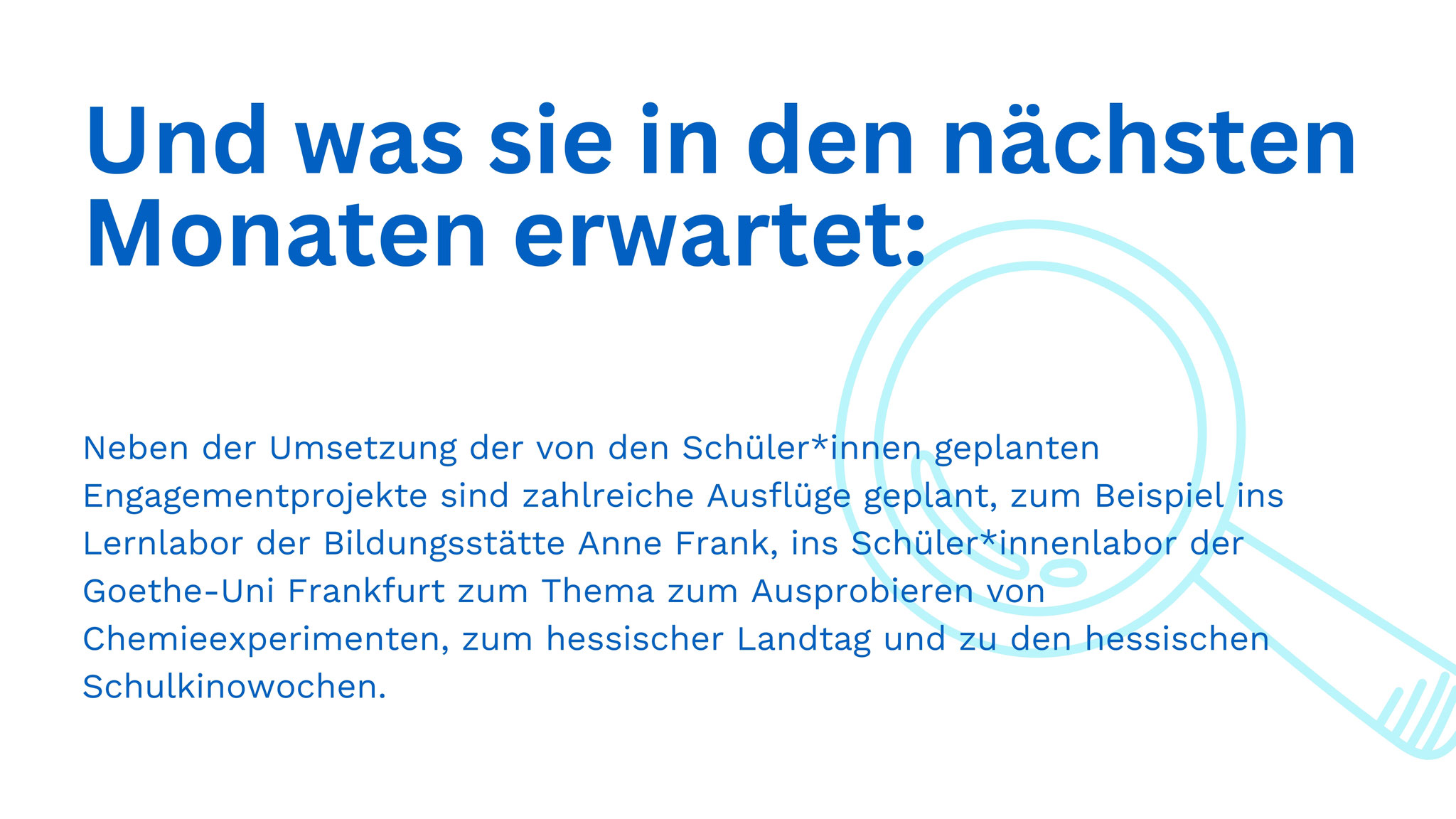 Im nächsten Halbjahr steht dann die Reise in die Zukunft bevor. Denn die geplanten Engagementprojekte bieten den Schüler*innen die Möglichkeit, aktiv an der Gestaltung ihrer Umwelt und Zukunft teilzunehmen.