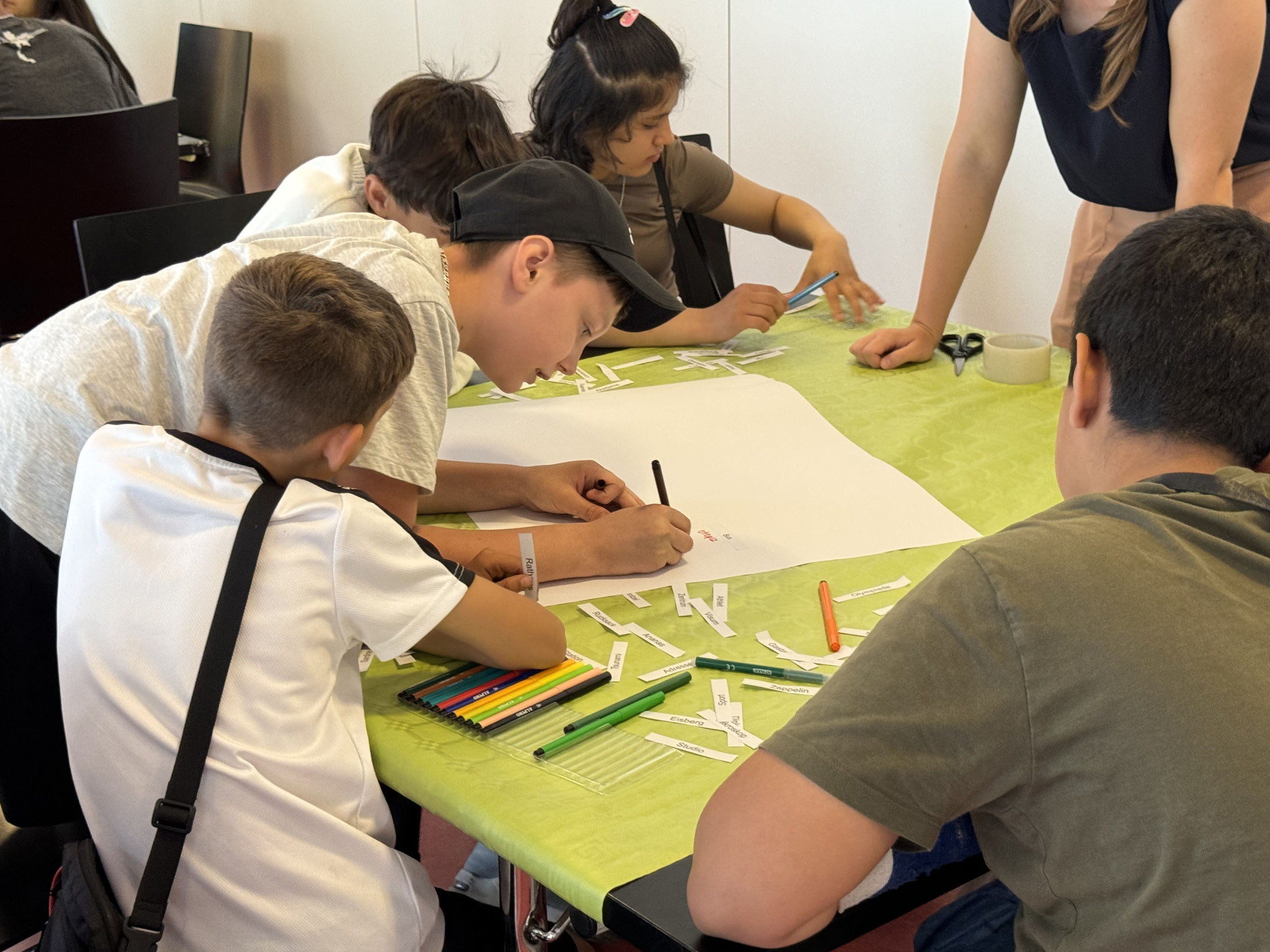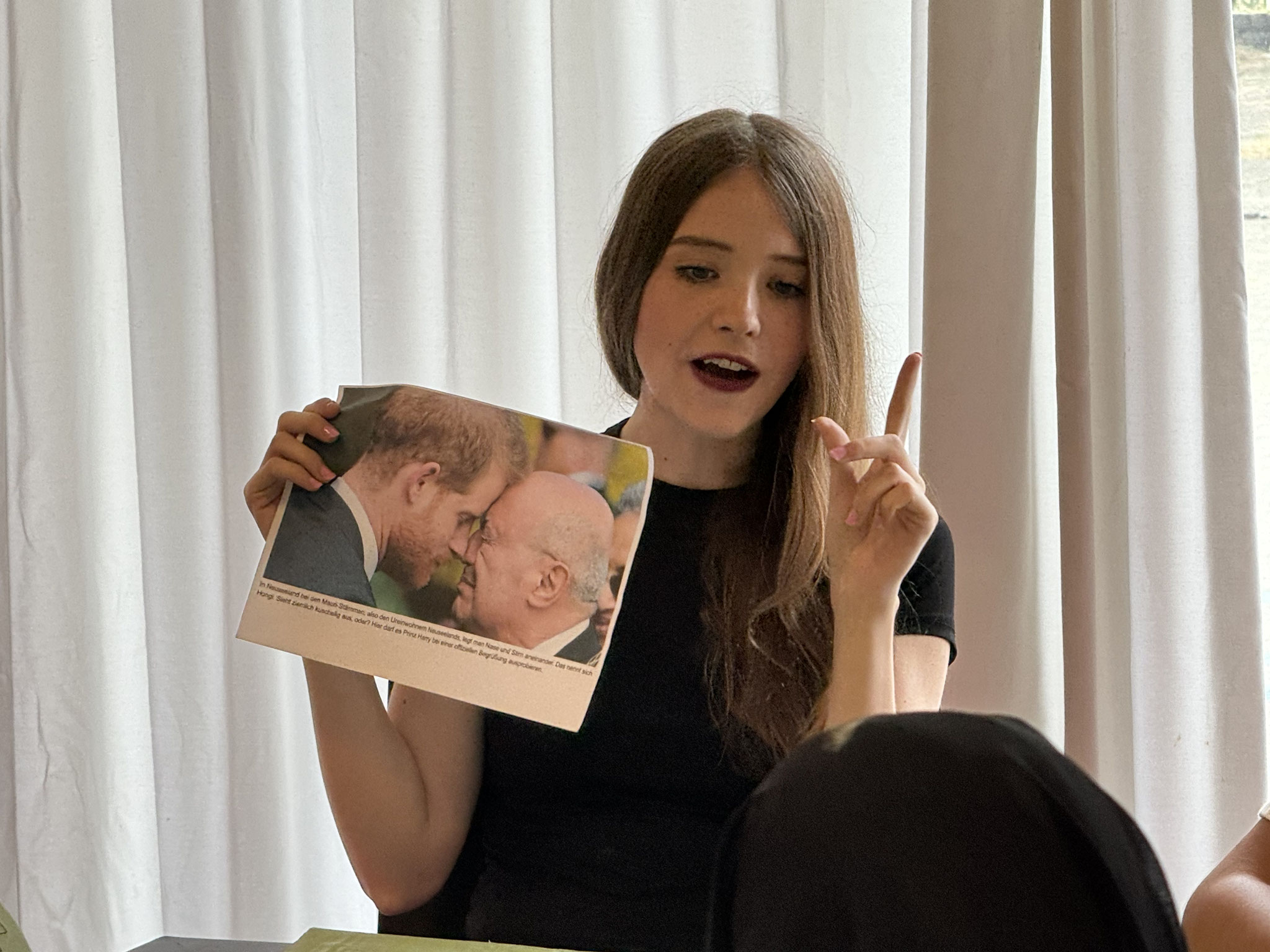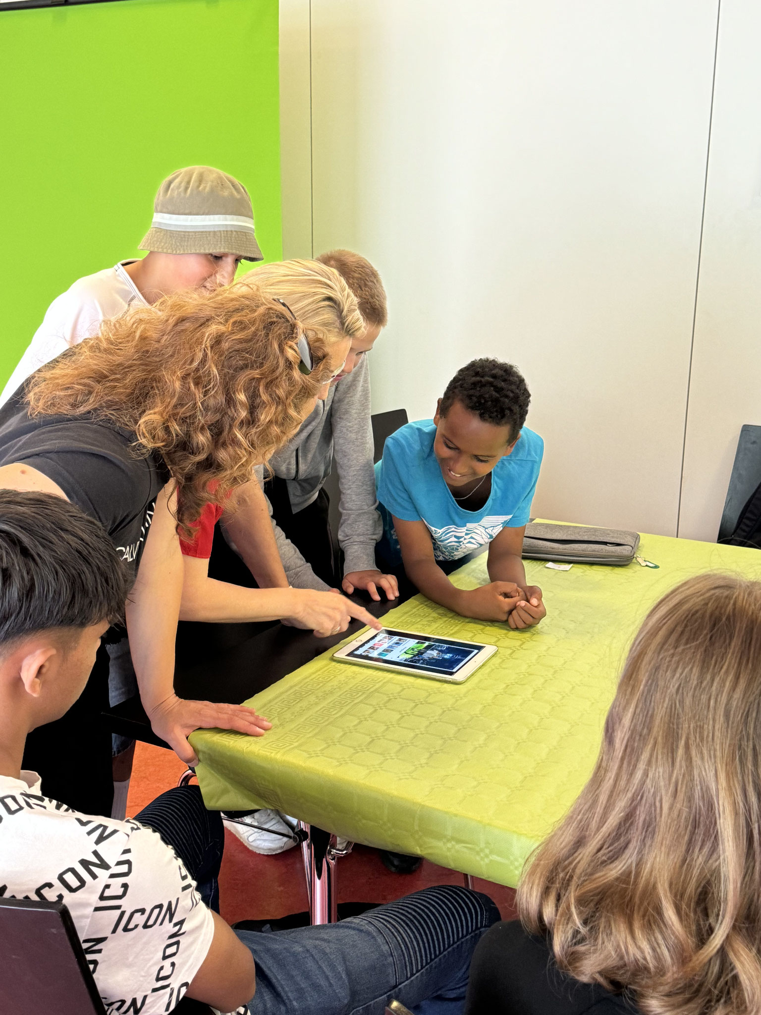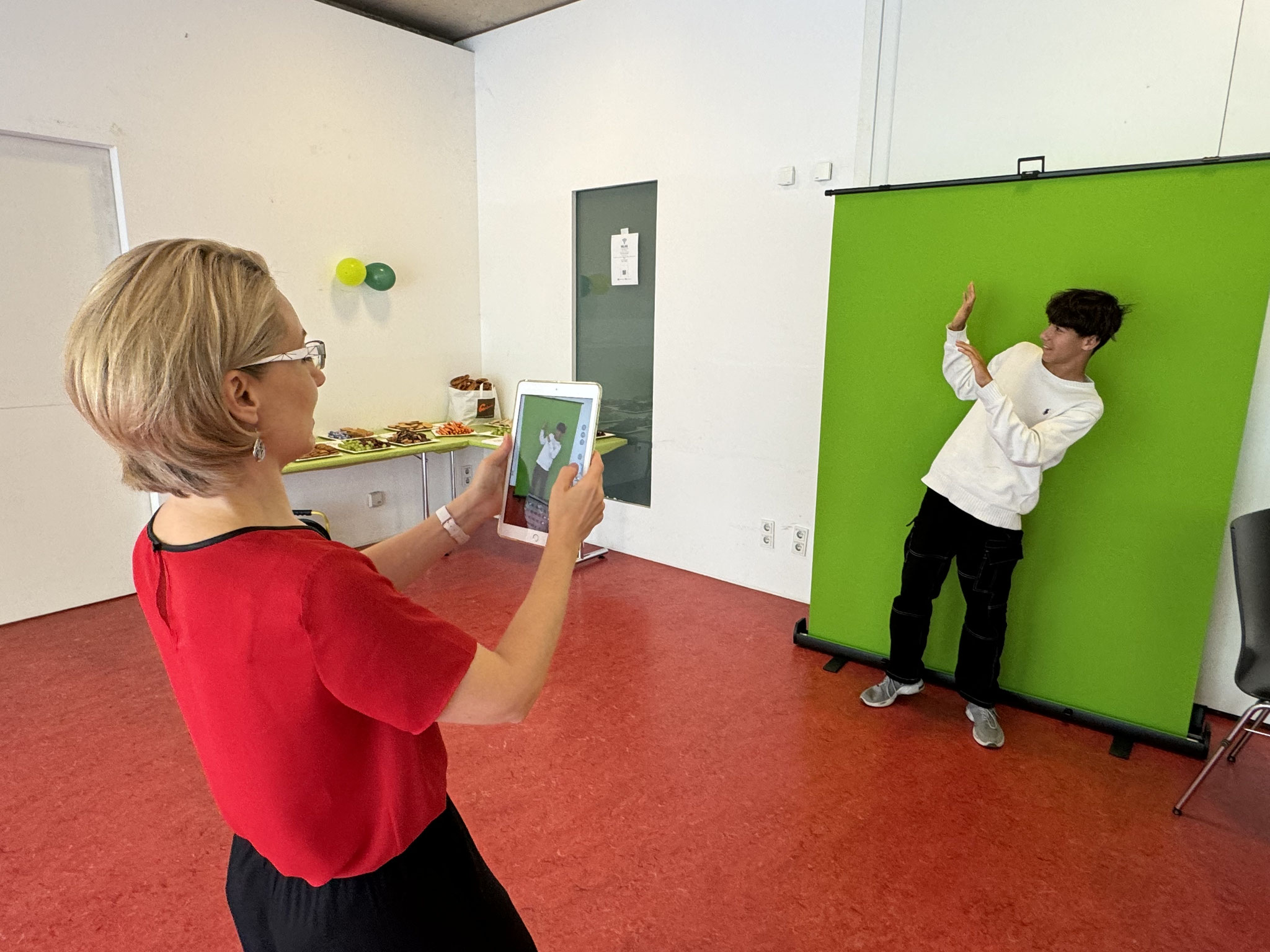 Ganz typisch für den Baustein gab es verschiedene Medien und Spiele, mit denen die Kinder sich ausprobieren konnten. Mit einem KI-Bildgenerator wurde das perfekte Klassenzimmer geschaffen. Ein Greenscreen erlaubte den Kindern, Fotos am Meer oder dem Schiefen Turm von Pisa zu machen. Und beim Erstellen eines multilingualen Wörterbuchs erklärte Schüler Levan den anderen nicht nur das georgische Alphabet, sie entdeckten auch, dass Wörter wie Kaffee, Internet und Traktor in vielen Sprachen gleich klingen.