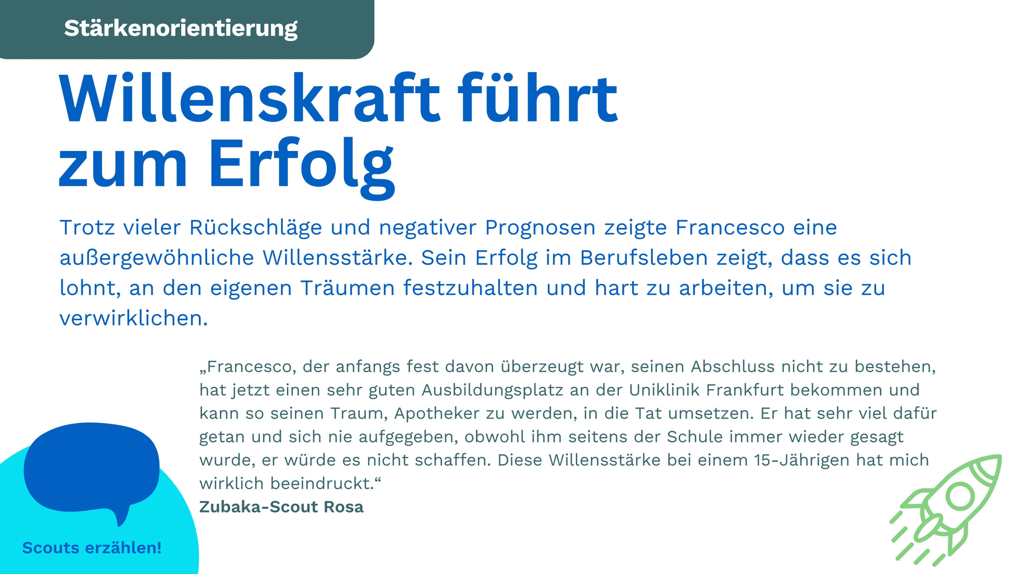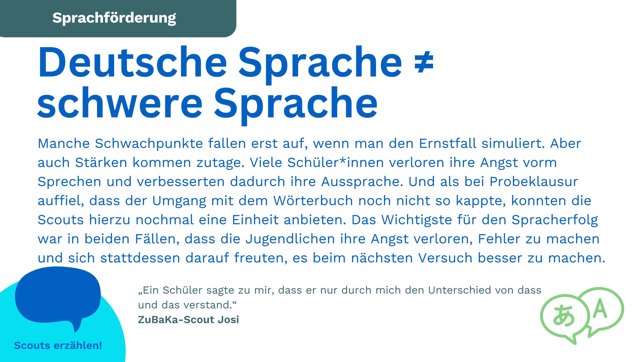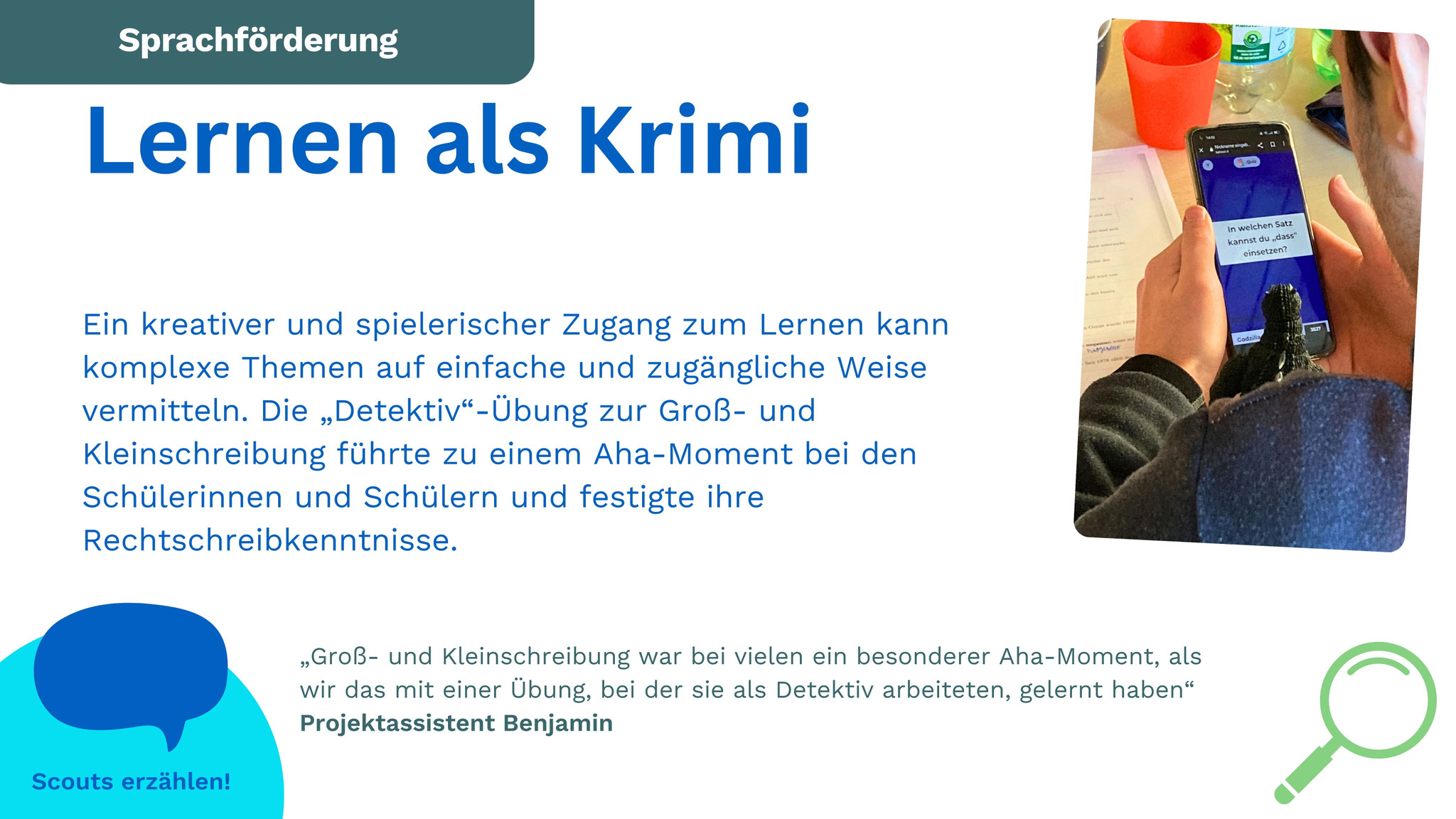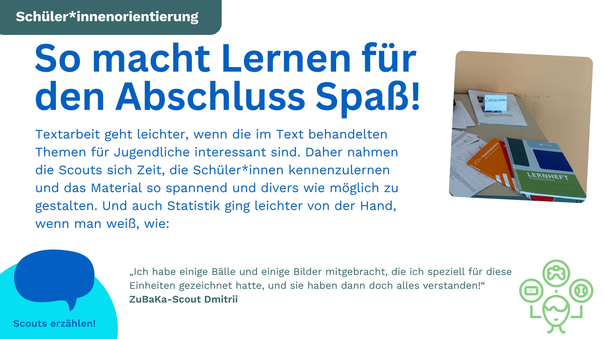 Unsere Scouts zeigen bei ihrer Arbeit, Schüler*innen dabei zu unterstützen ihren Hauptschulabschluss zu erlangen, oft einen guten Riecher. Sie schauen genau hin und können so Material zusammenstellen, das die Interessen der Teilnehmer*innen trifft.