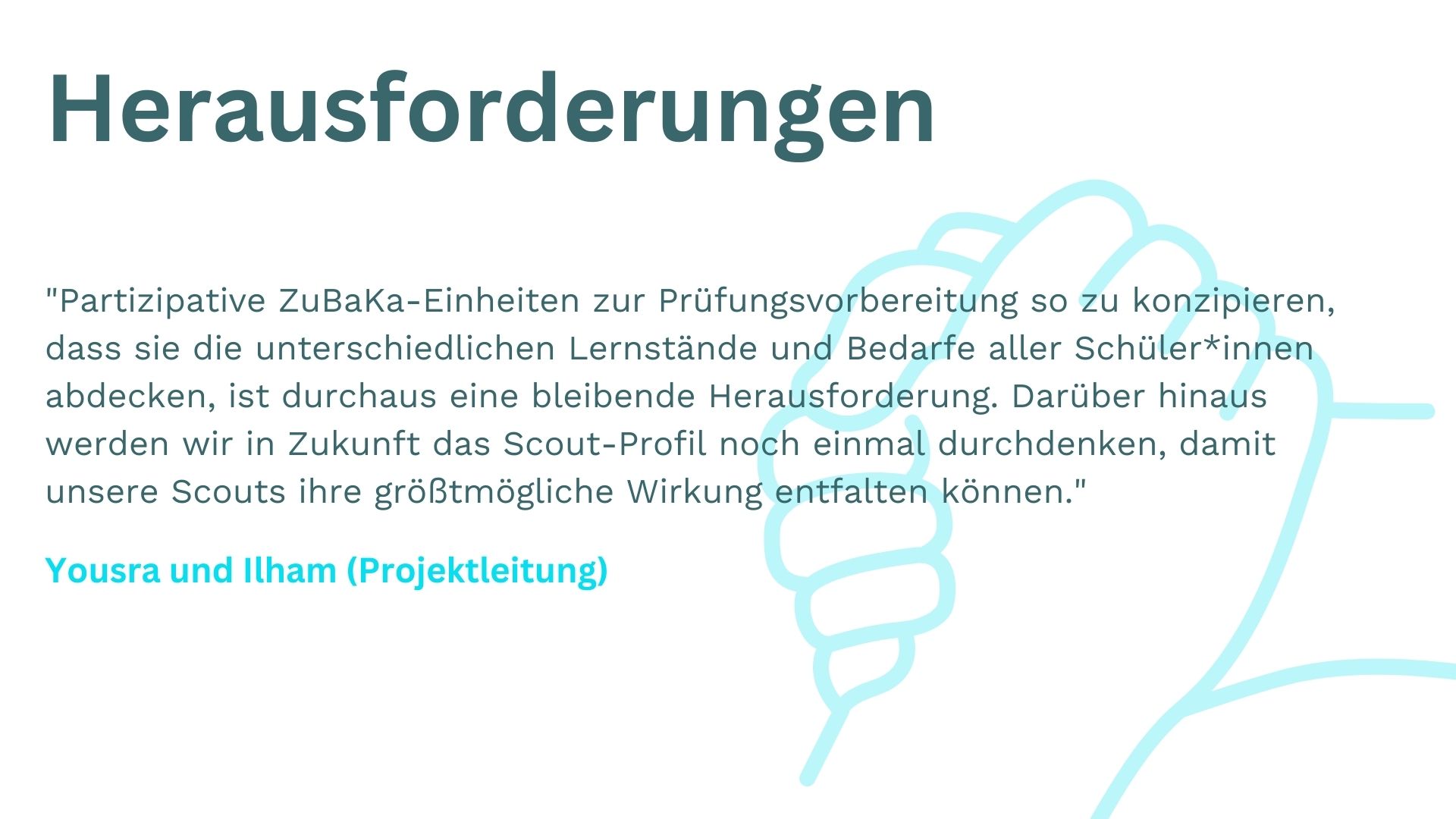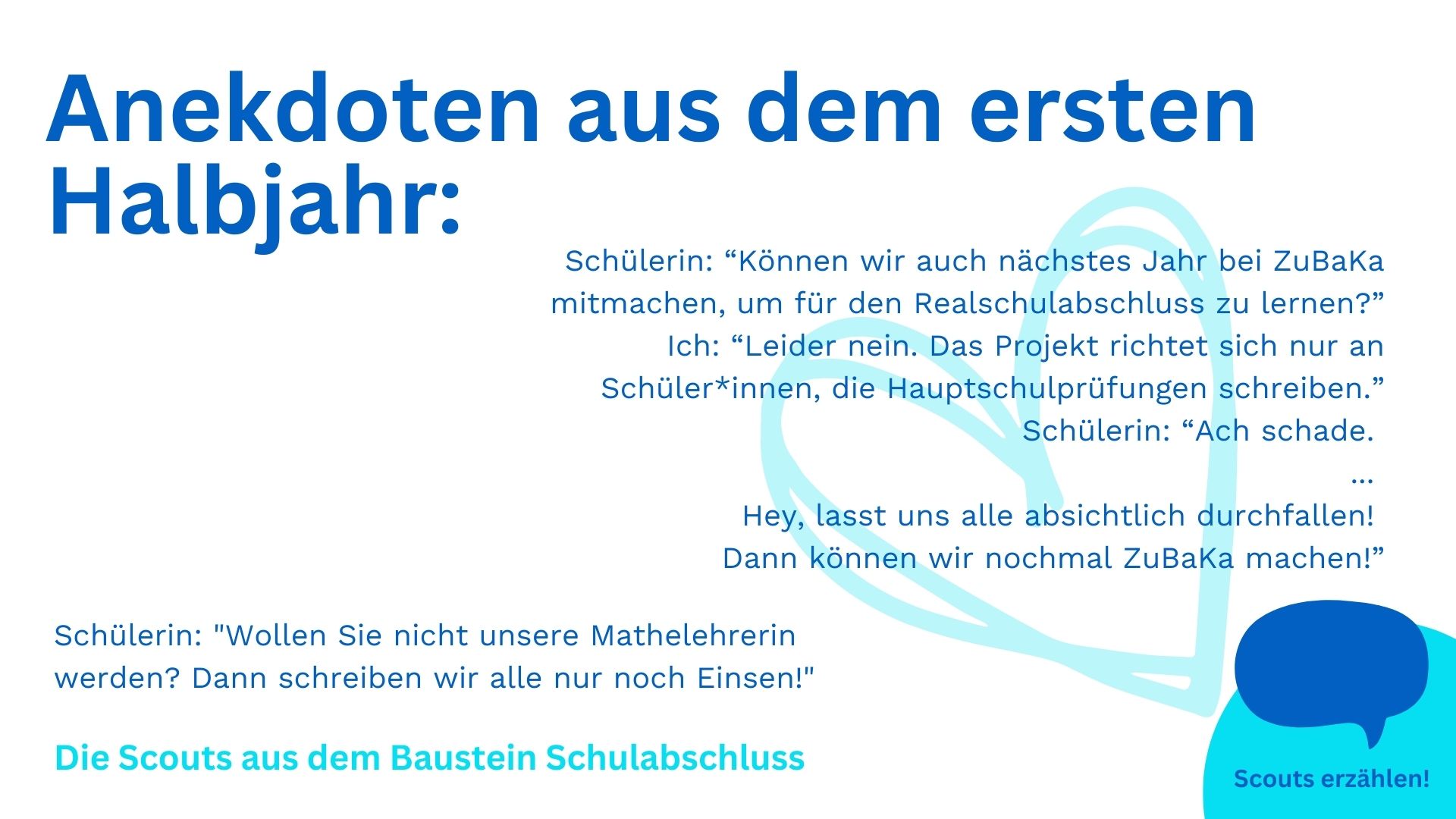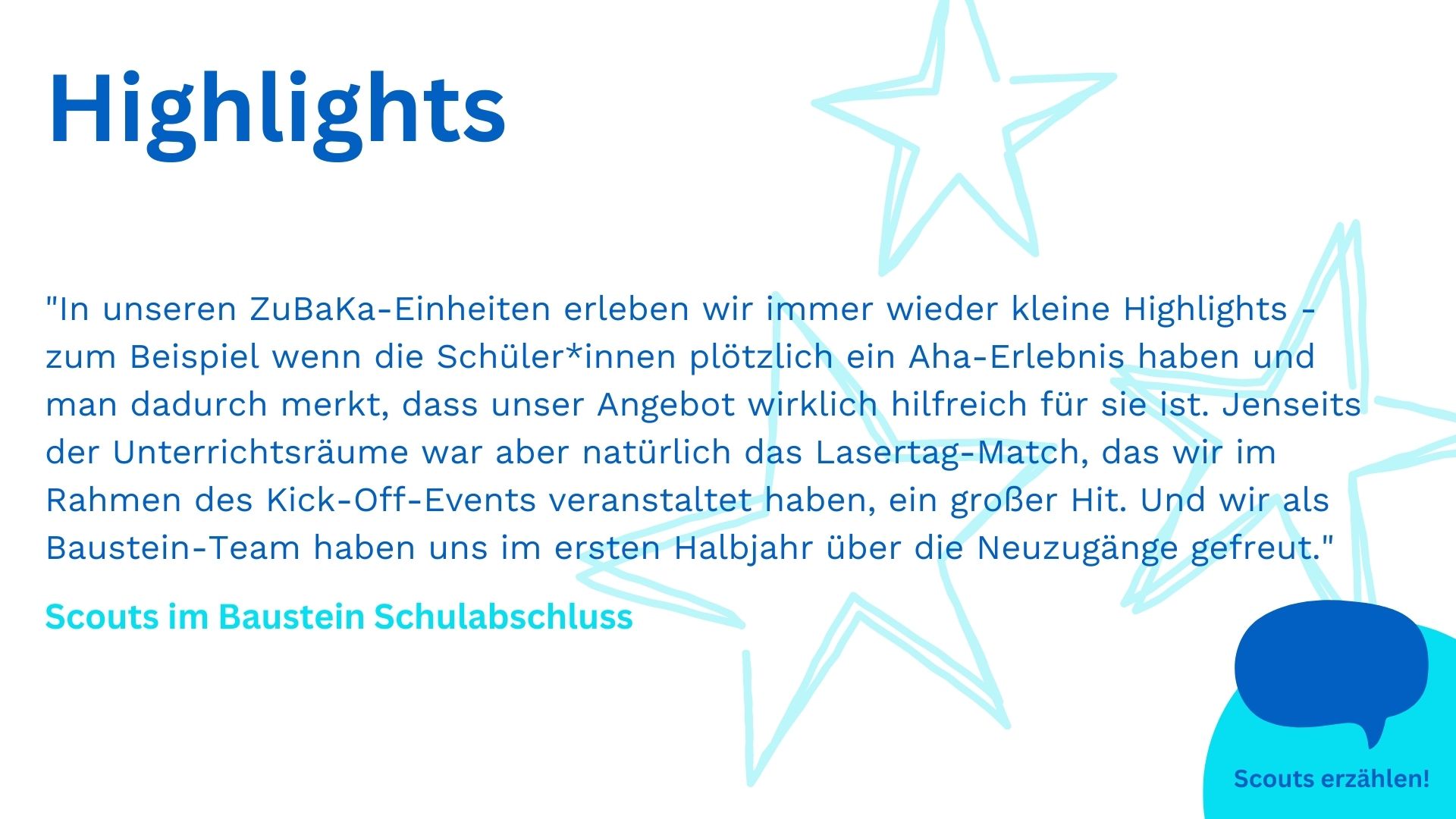 Die Scouts im Projekt Schulabschluss verstehen es immer wieder, Prüfungsvorbereitung nicht wie normalen Unterricht aussehen zu lassen. Und nun konnten wir mit diesem Konzept sogar einen neuen ZuBaKa-Standort erschließen! Was noch alles passiert ist, erzählen Yousra und Ilham, das Projektleitungsdoppel von Schulabschluss im Rhein-Main-Gebiet. Und selbstverständlich teilen auch die Scouts ihre Eindrücke vom zurückliegenden ersten Schulhalbjahr.