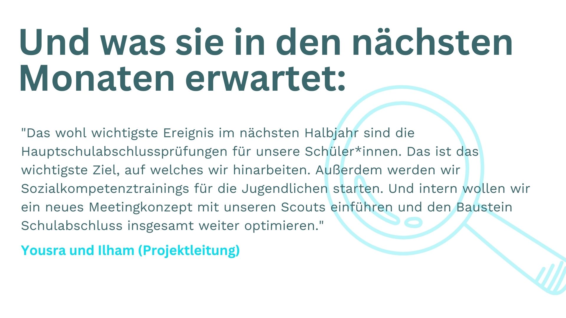 "Da es bei uns in Gießen erst jetzt richtig losgeht, steht im nächsten Halbjahr erst einmal der Projektstart an den Partnerschulen an. Dabei wird die Beziehungsarbeit mit den Schüler*innen im Fokus stehen. Wir wollen den Schülis Lust machen auf berufliche Perspektiven, ihr Selbstvertrauen stärken und Lernlücken erkennen. Außerdem stehen auch Themen wie 'Lernen lernen' auf dem Plan."