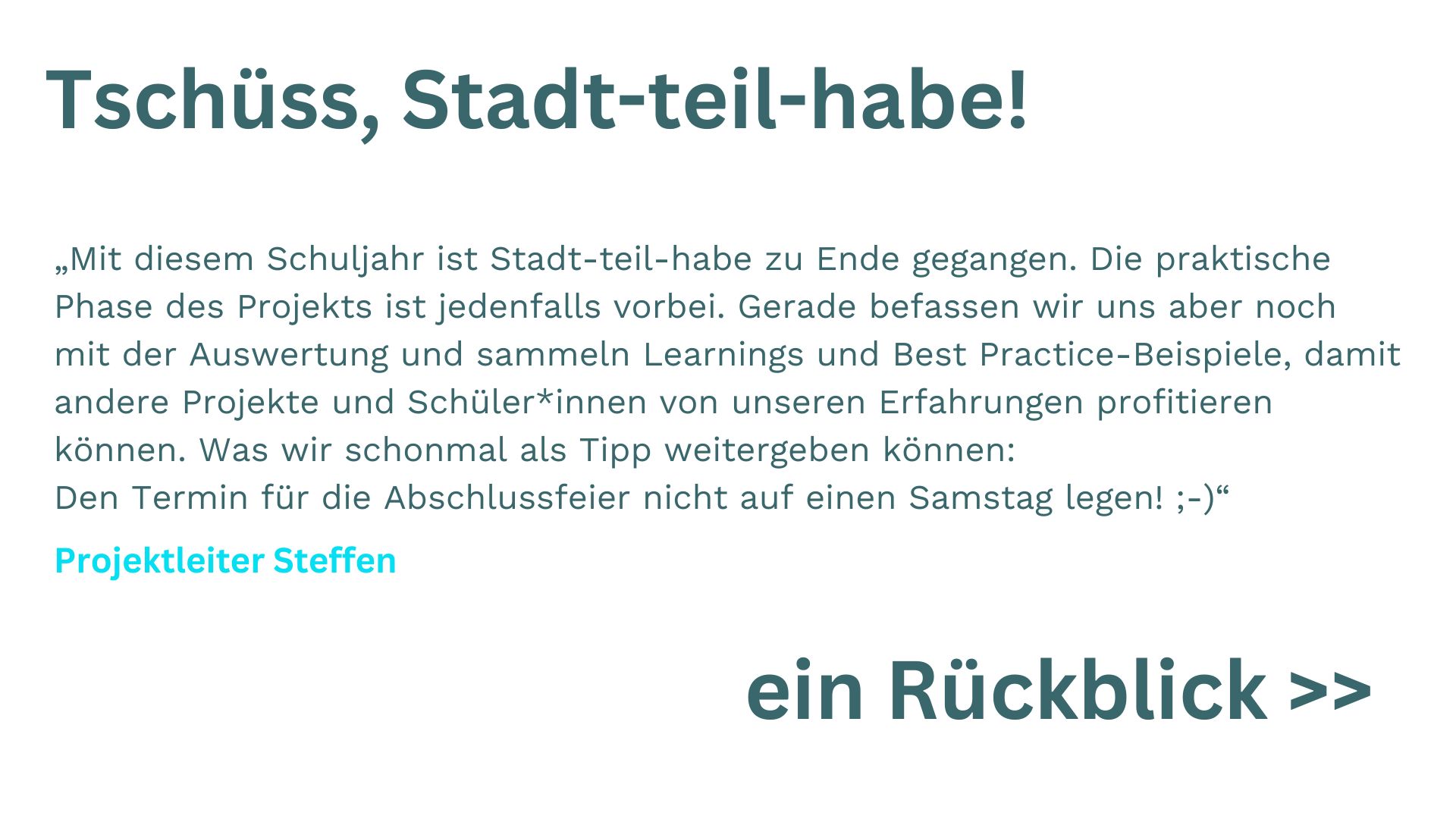 Zwei Schuljahre lang hat der Baustein Stadt-teil-habe deutschlernende Schüler*innen bei der Entdeckung ihres Stadtteils (und der deutschen Sprache) unterstützt. Nun ist es Zeit, Abschied zu nehmen! Jedoch nicht ohne einen letzten Baustein-Update zum Durchklicken.