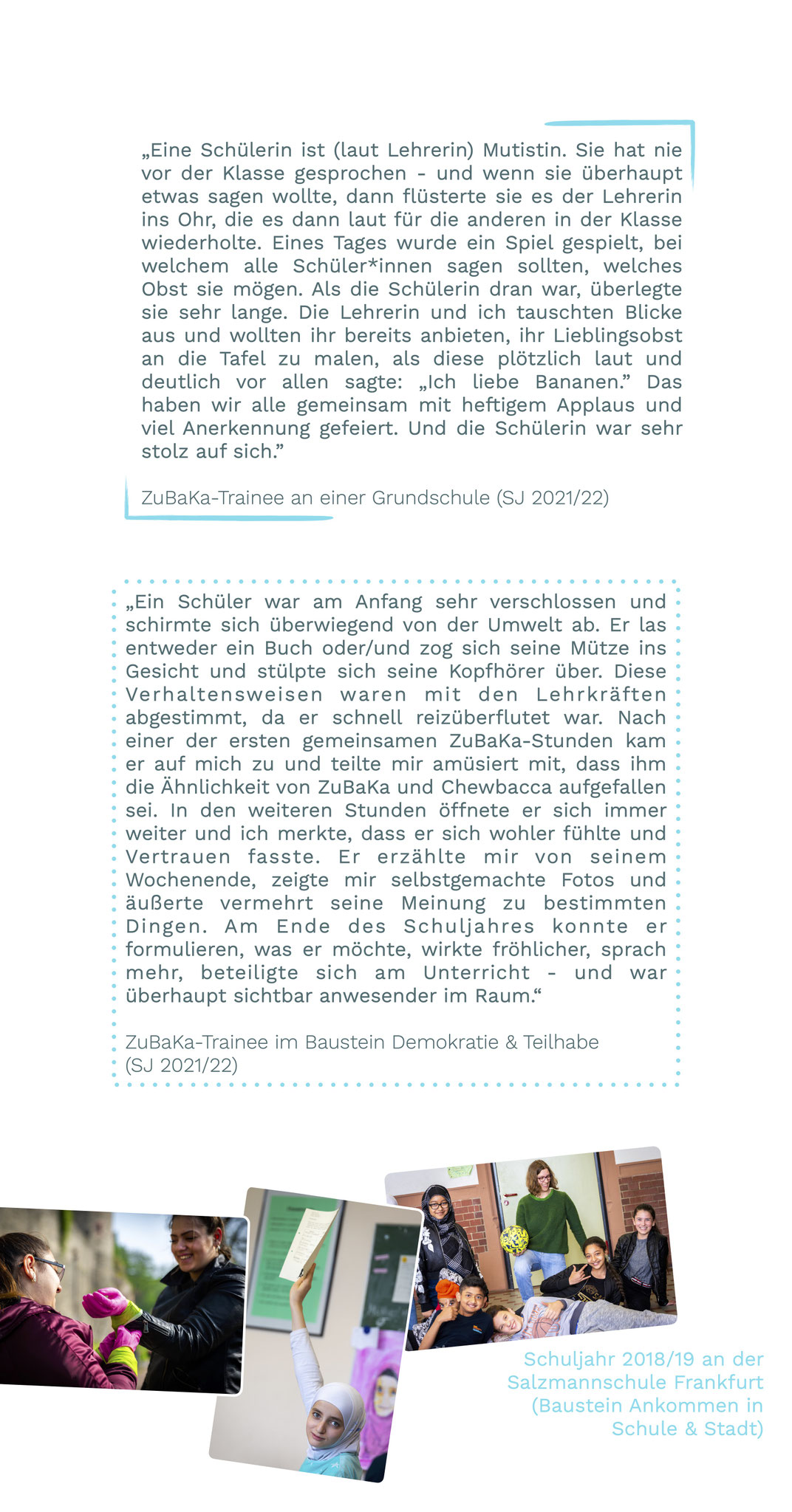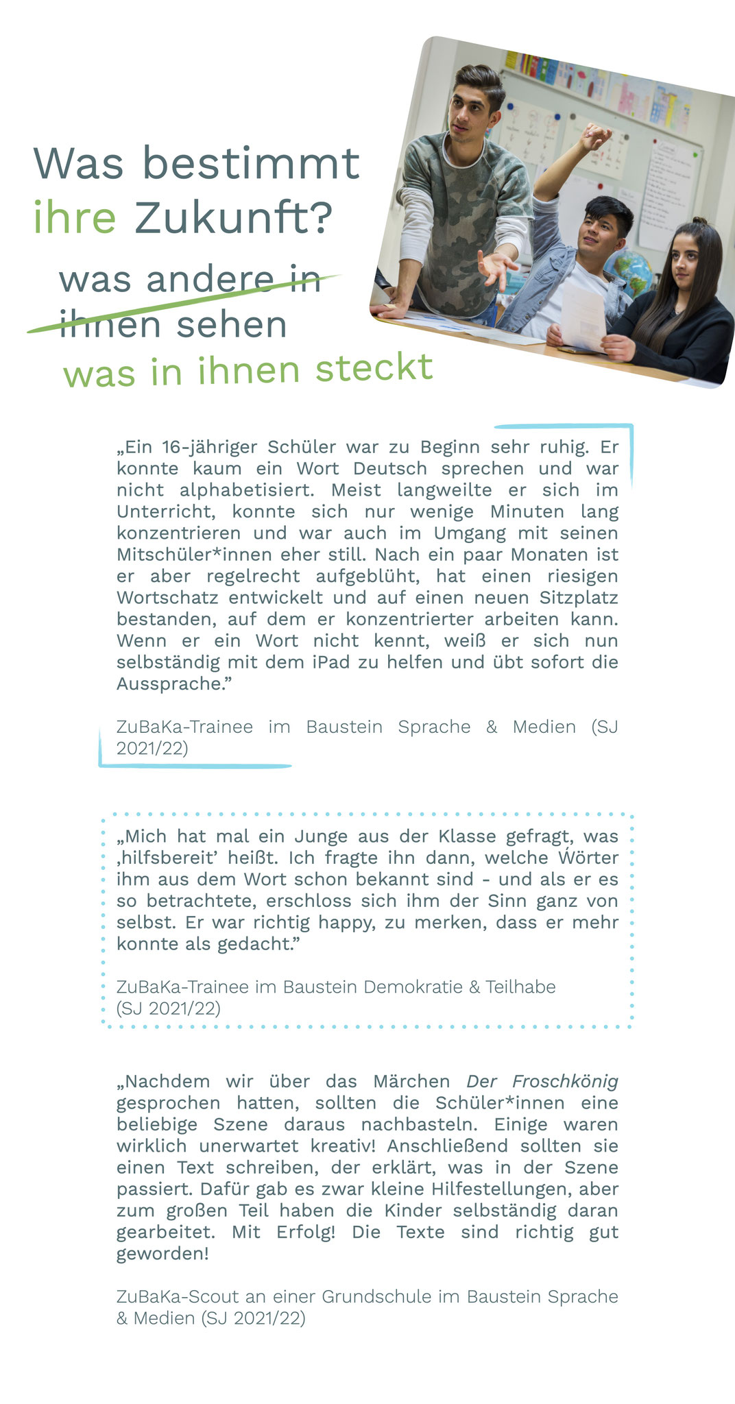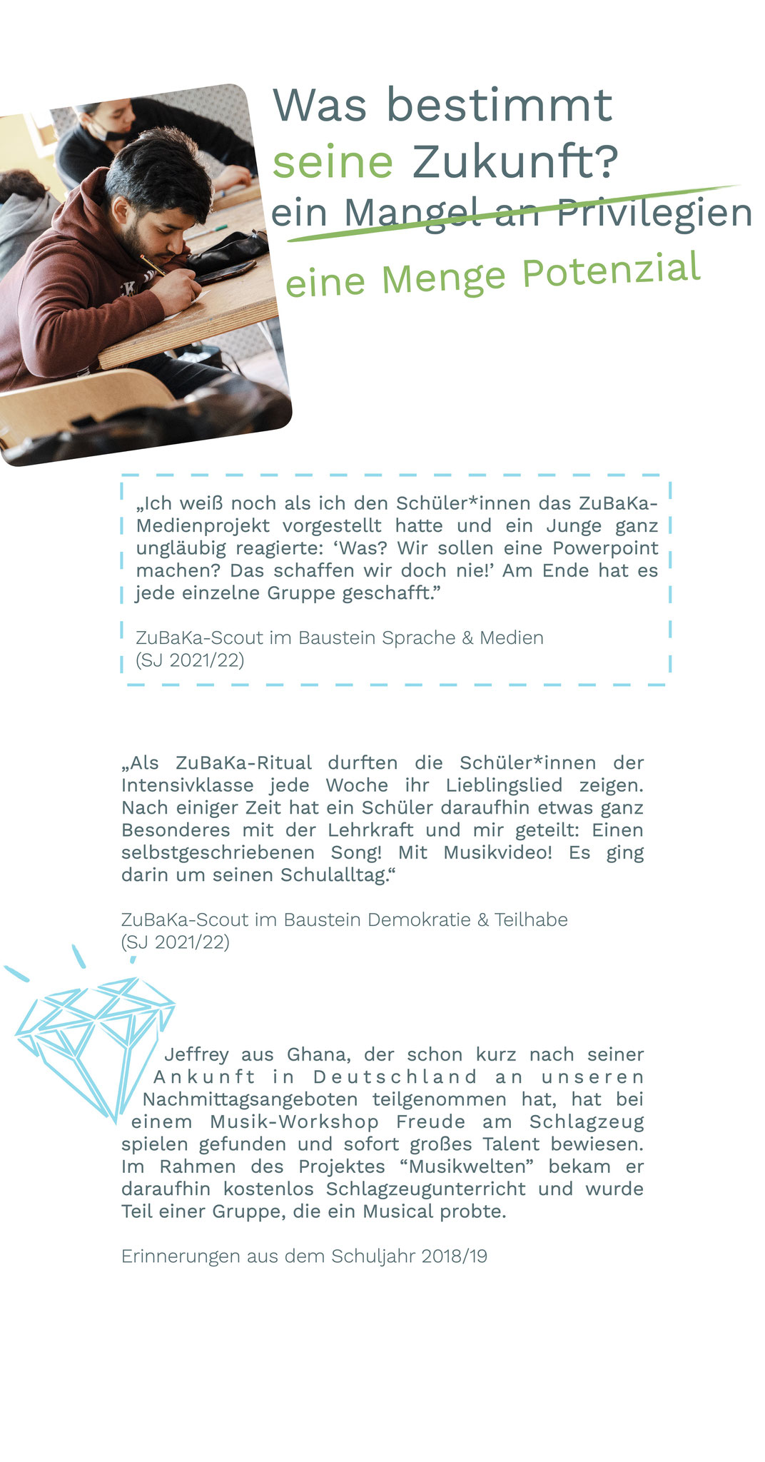 Die Umstände, unter denen man aufwächst, formen auch den Verlauf des zukünftigen Lebens beträchtlich. Sehr überspitzt könnte man sagen: Herkunft = Zukunft. Doch was bei dieser Formel viel zu häufig außer Acht gelassen wird: Hinter ihr stecken Menschen. Mit Persönlichkeit, Stärken und Träumen, die es allesamt verdient haben, geträumt zu werden. Und diese Menschen sind es, die uns tagtäglich dazu inspirieren, unser Engagement für mehr Bildungsgerechtigkeit fortzusetzen und die Frage "Woher kommst du?" mit "Wohin willst du?" zu ersetzen. Du willst mitmachen? Hier geht es zu unseren offenen Stellen! Und in der nachfolgenden Bildergalerie bekommst du schonmal einen Einblick in die Welt vieler ZuBaKa-Schüler*innen - und in die Welt von ZuBaKa selbst.