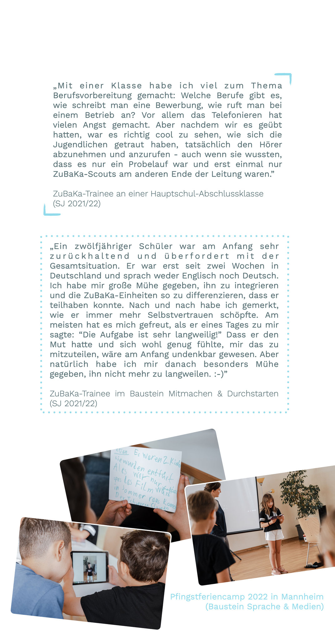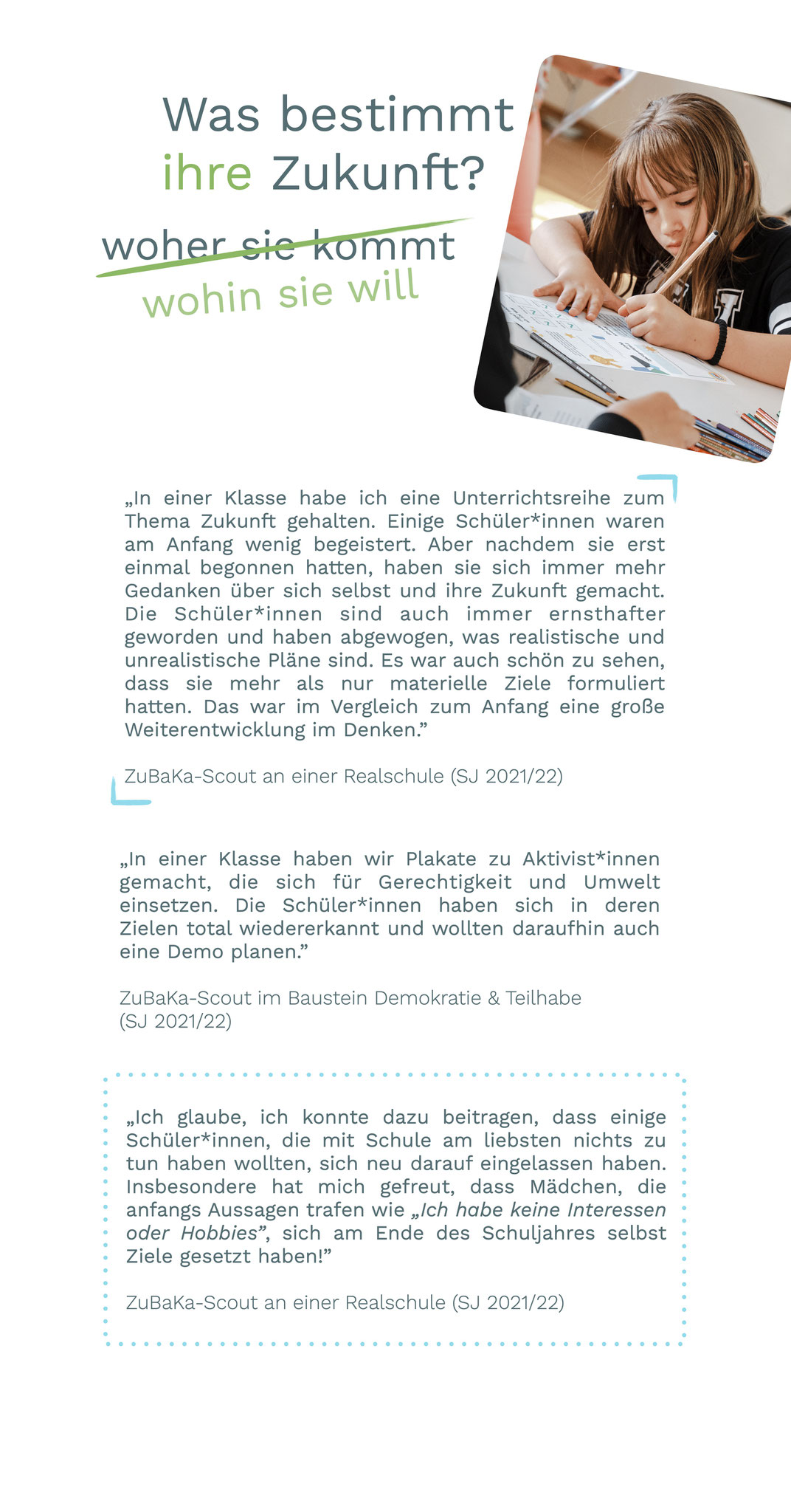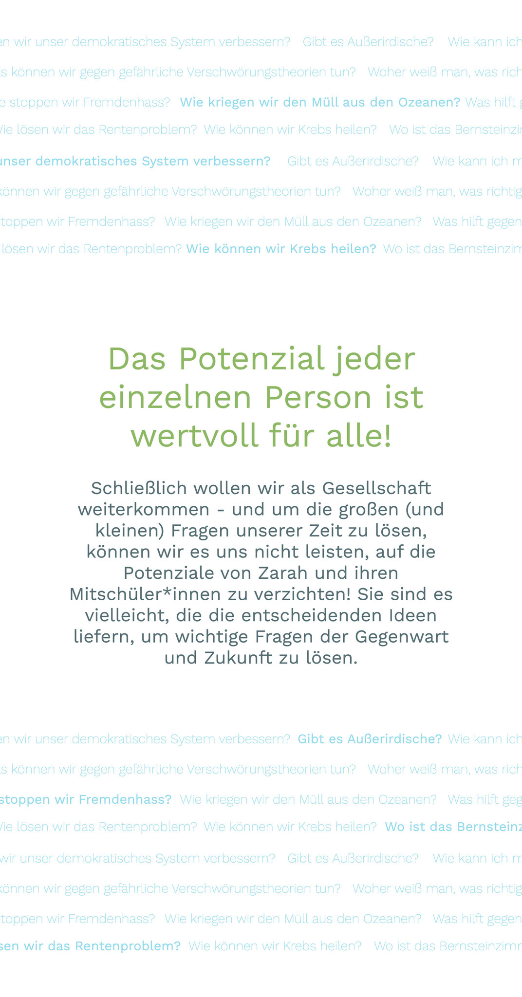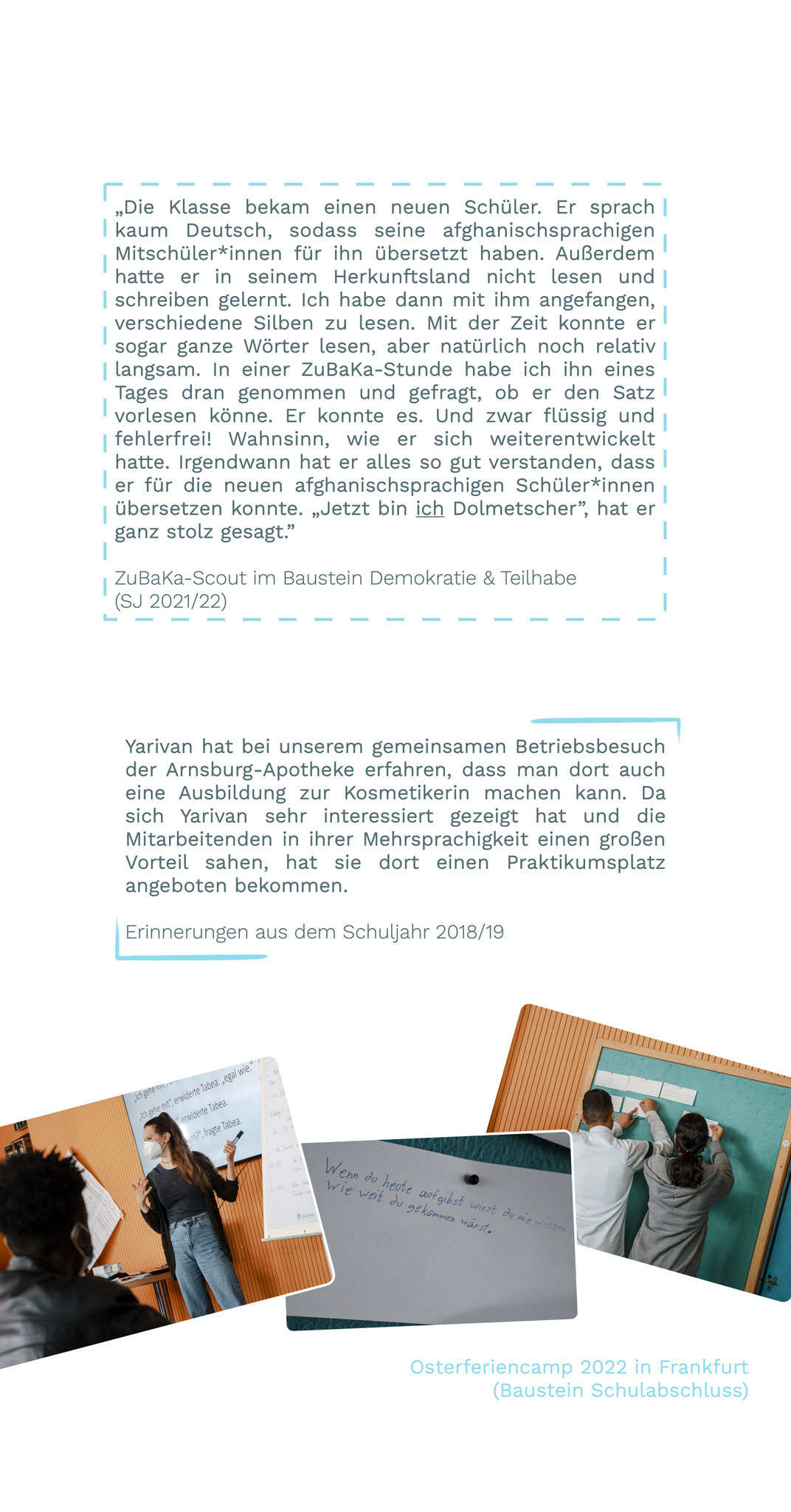 Die Umstände, unter denen man aufwächst, formen auch den Verlauf des zukünftigen Lebens beträchtlich. Sehr überspitzt könnte man sagen: Herkunft = Zukunft. Doch was bei dieser Formel viel zu häufig außer Acht gelassen wird: Hinter ihr stecken Menschen. Mit Persönlichkeit, Stärken und Träumen, die es allesamt verdient haben, geträumt zu werden. Und diese Menschen sind es, die uns tagtäglich dazu inspirieren, unser Engagement für mehr Bildungsgerechtigkeit fortzusetzen und die Frage "Woher kommst du?" mit "Wohin willst du?" zu ersetzen. Du willst mitmachen? Hier geht es zu unseren offenen Stellen! Und in der nachfolgenden Bildergalerie bekommst du schonmal einen Einblick in die Welt vieler ZuBaKa-Schüler*innen - und in die Welt von ZuBaKa selbst.